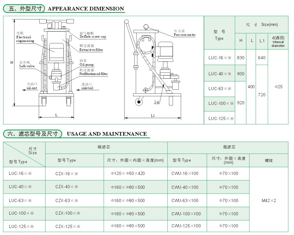 LUC濾油車吸油過濾器不僅適合于各類液壓油、潤滑油的過濾凈化,而且廣泛用于電站、電廠、變電工區(qū)、石油、化工、冶金、鋼鐵、交通、拖拉機站、國防工業(yè)等單位過濾凈化絕緣油、透平油、潤滑油、液壓油、機械油等液體油液中的雜質微粒,能達到廢油再生的目的。